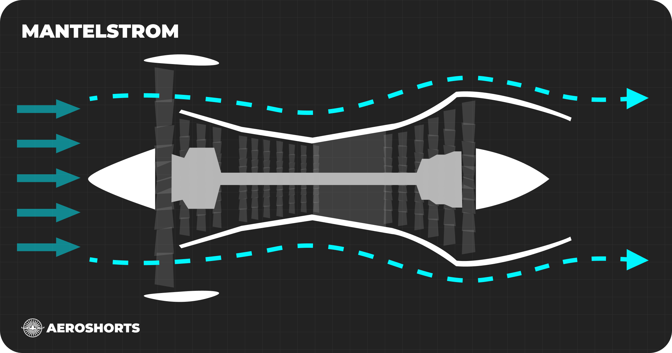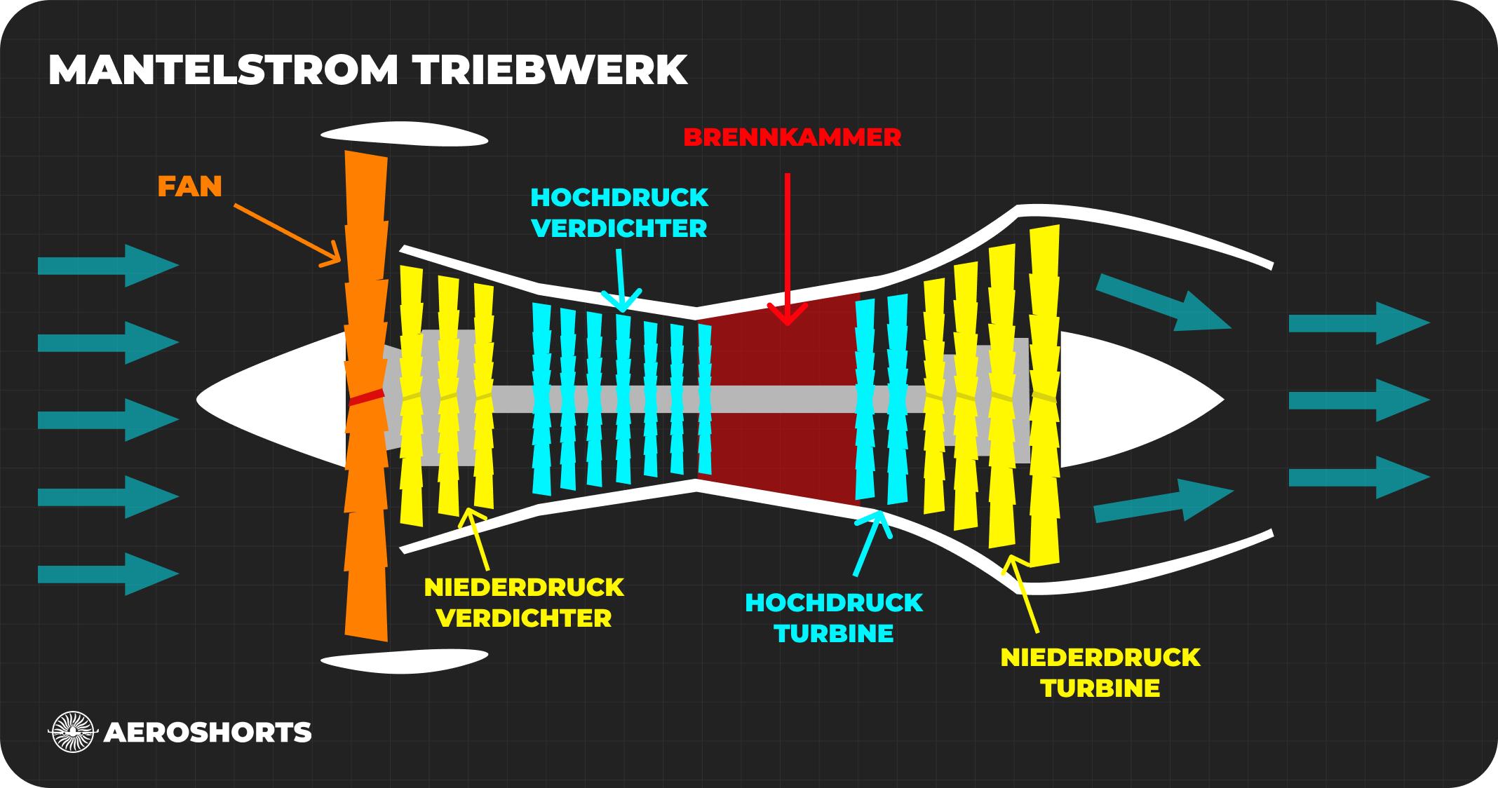 Ein Turbofan ist eine Art Strahltriebwerk, das Schub erzeugt, indem es eine große Menge Luft nach hinten beschleunigt. Ein Teil dieser Luft strömt durch den heißen Kern des Triebwerks, wo Treibstoff verbrannt wird, während der andere Teil außen am Kern vorbeifließt – dieser äußere Luftstrom wird Mantelstrom genannt. Die Kombination aus Kernstrom und Mantelstrom gibt dem Triebwerk seinen Namen: „Turbo“ steht für die Turbine und „Fan“ für den großen Ventilator an der Front.